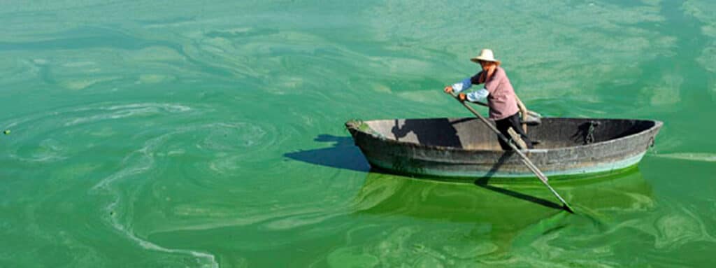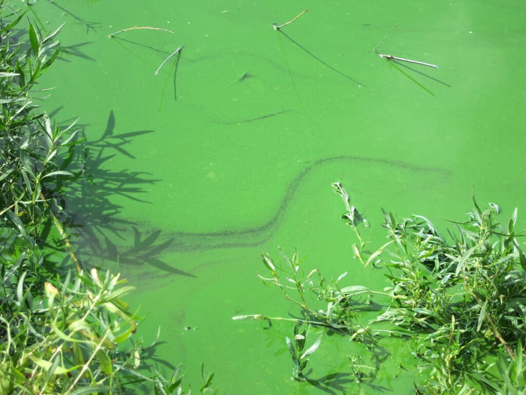 Blue green algae float on the water and can create mats on the surface or make it look scummy.