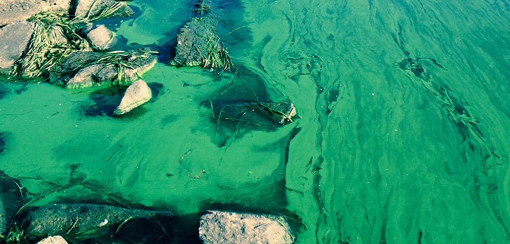 Blue green algae can be blue, green, brown, or reddish purple looking in the water. These algae can be one-celled, filamentous (stringy), or grouped together.