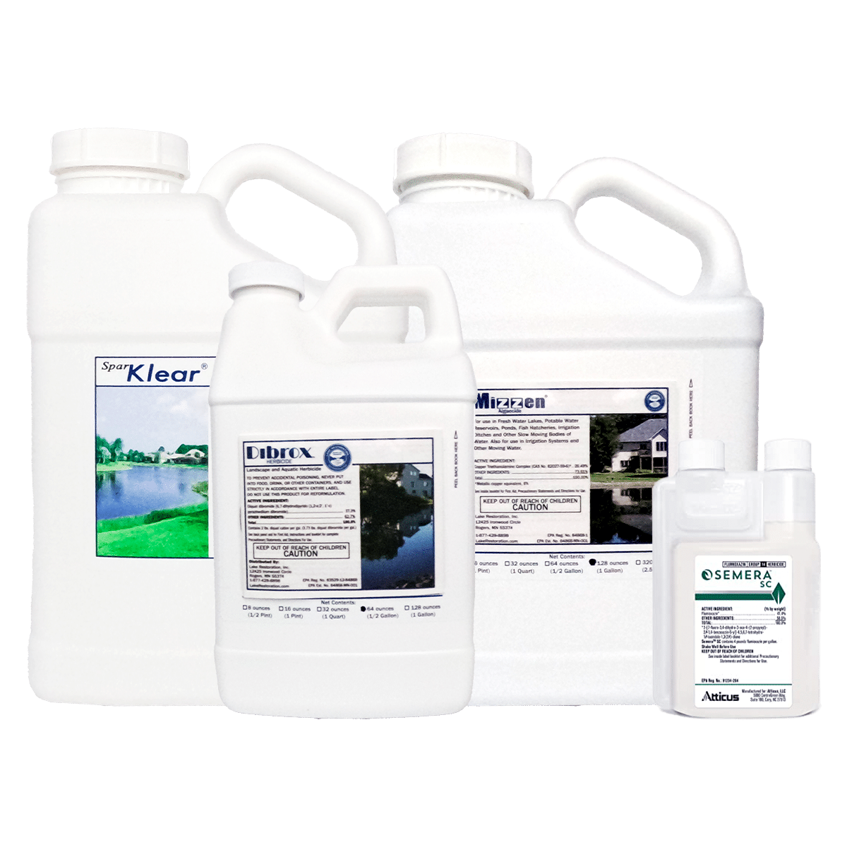 Semera manufactured by Atticus, LLC. Flumigard manufactured by Alligare, LLC. Dibrox and SparKlear are manufactured for Lake Restoration, Inc. Mizzen is manufactured by Lake Restoration, Inc.